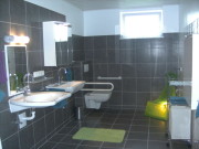 Unser Bad in der Ferienwohnung "Haus am Berg" ist sehr großzügig gestaltet. Zwei Waschbecken, das WC mit Haltegriffen und die 1,20m lange Dusche mit Sitzplatz lassen keine Wünsche übrig. Für den besonderen Komfort gibt es einen Handtuchheizkörper und Fußbodenheizung.