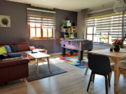 In der Ferienwohnung "Rhönluft" gibt es in dem modern eingerichteten Wohnzimmer eine große Ledercouch und als Highlight einen Kicker...
