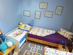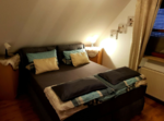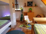 Die Ferienwohnung hat zwei separate Schlafzimmer: Einmal mit großem Doppelbett und einmal mit drei Einzelbetten, von denen eins 1,60m lang ist und mit Rausfallschutz gesichert ist.